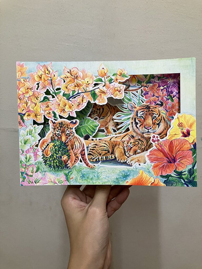 따뜻하고 밝은 팔레트는 보는 이의 시선을 사로잡고, 축하의 의미를 전달하며 인간 환경 속에서도 자연의 아름다움을 떠올리게 합니다.