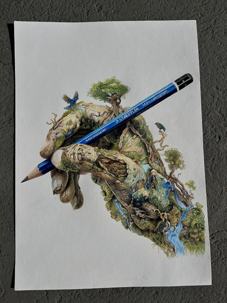 작가의 뛰어난 색연필 사용은 풍경의 질감을 놀라운 감성으로 전달하며 빛과 그림자의 균형을 맞춰 생생하면서도 부드럽게 흐릿하게 느껴지는 몽환적인 분위기를 연출합니다.